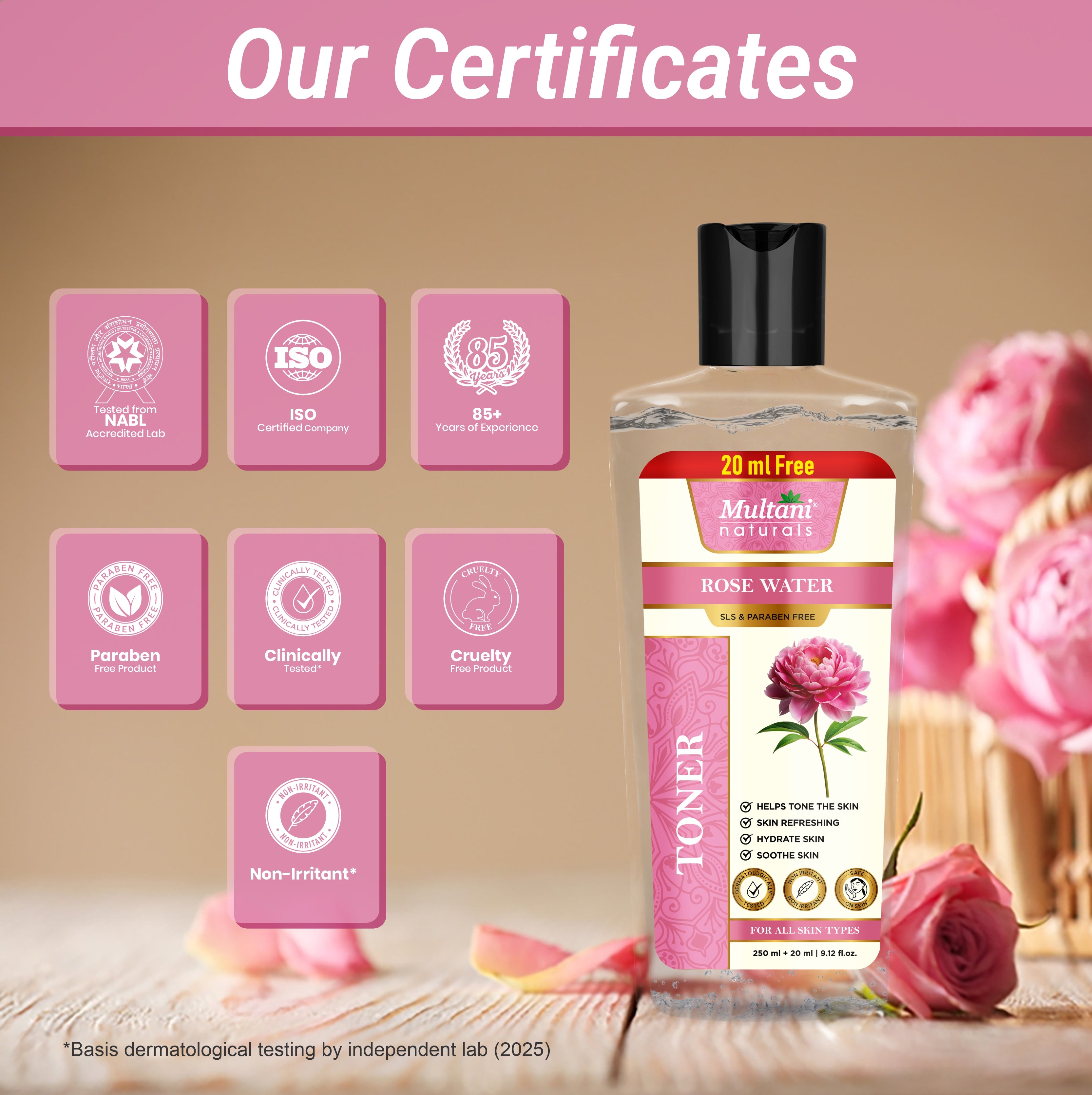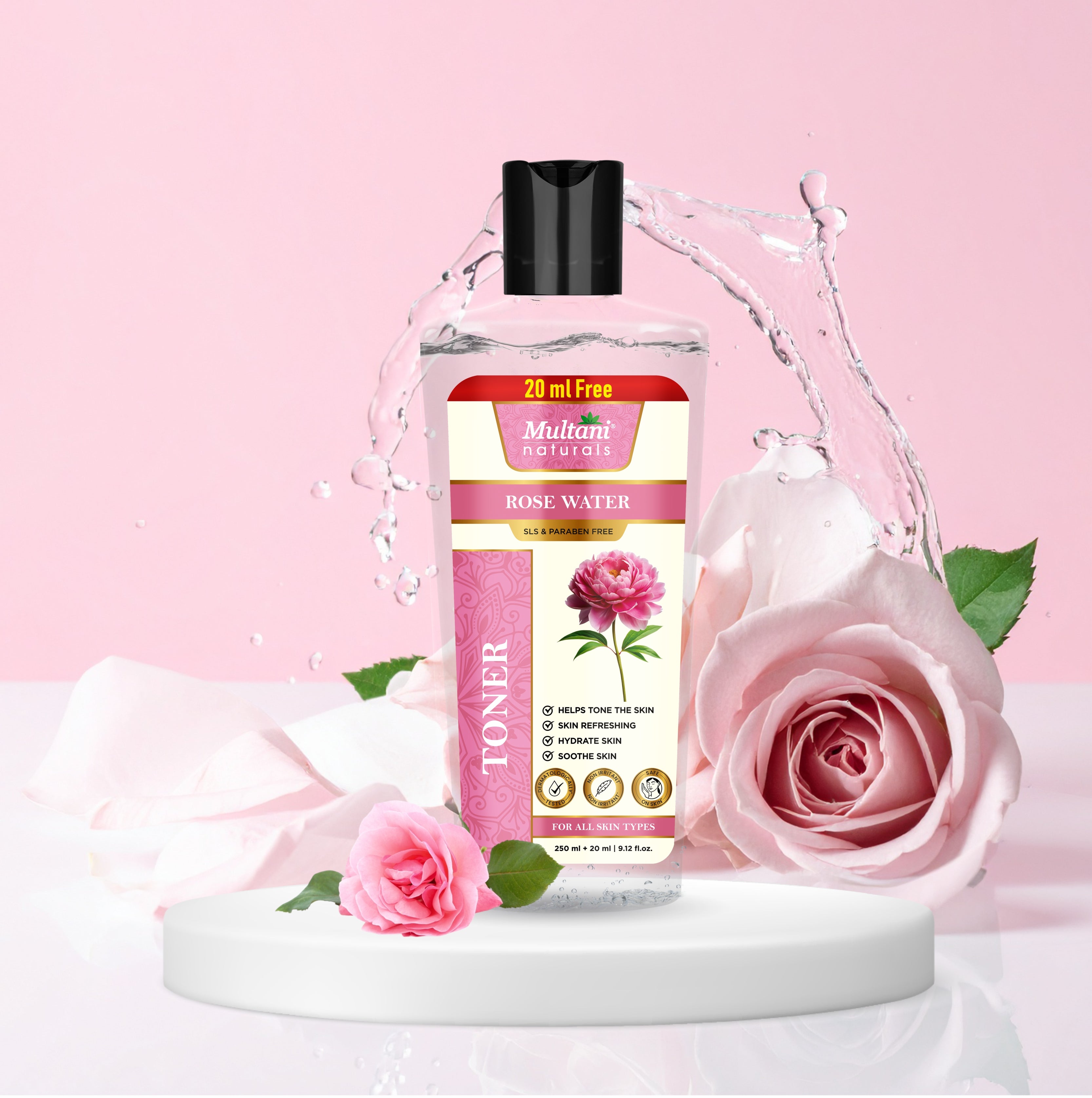Multani Naturals Rose Water Toner | Oily Acne Prone Dry Combination Skin | Pore Tightening & Glowing Skin | Fades Blemishes, Brightens & Smoothens | Women & Men | SLS & PARABEN FREE - 270 ml (0.92/ Per Ml)