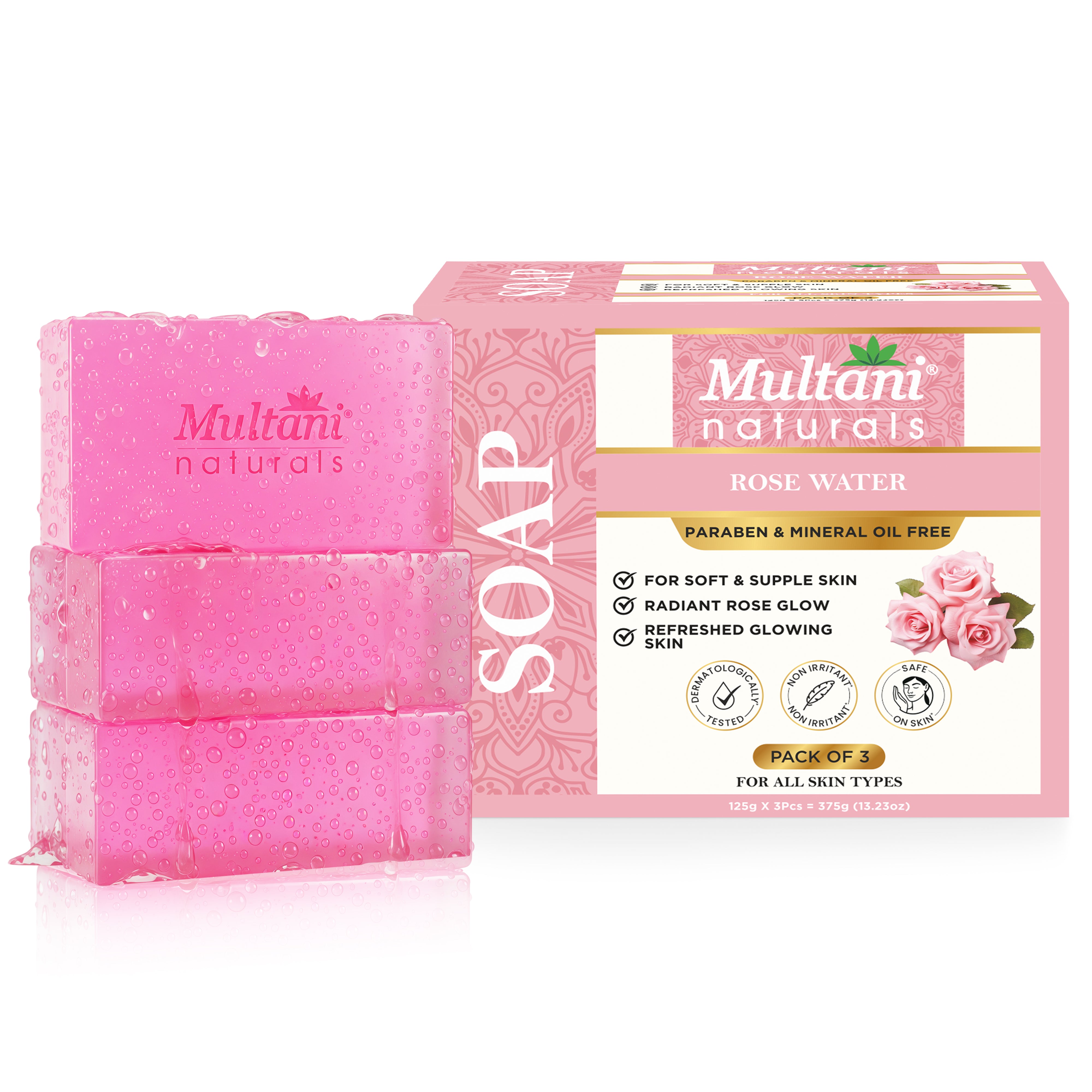 Multani Naturals Rosewater Soap I Ayurvedic Bath Soap for Men & Women | Handmade Herbal Soap Bar with Rose Water & Glycerin | Helps Sooth & Calm Irritated Skin, Hydrate & Softens Skin and Reduces Wrinkles & Fine Lines with Each Use - 125 GM
