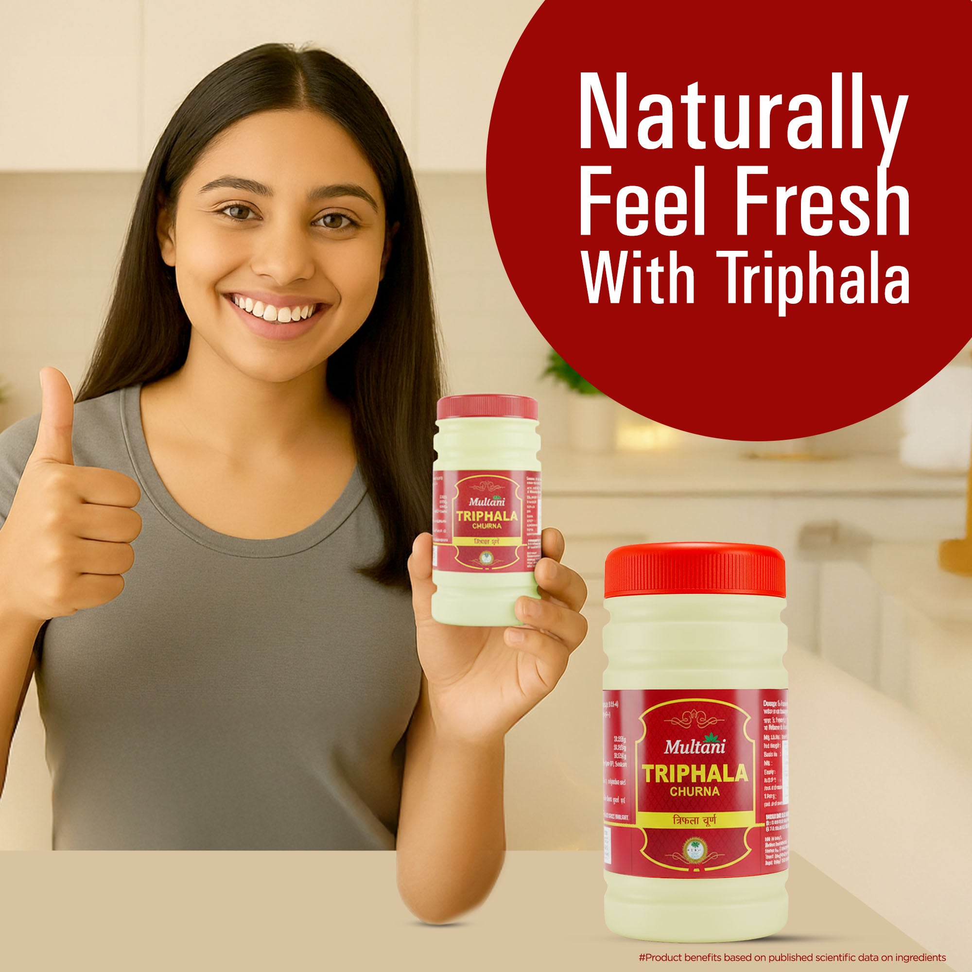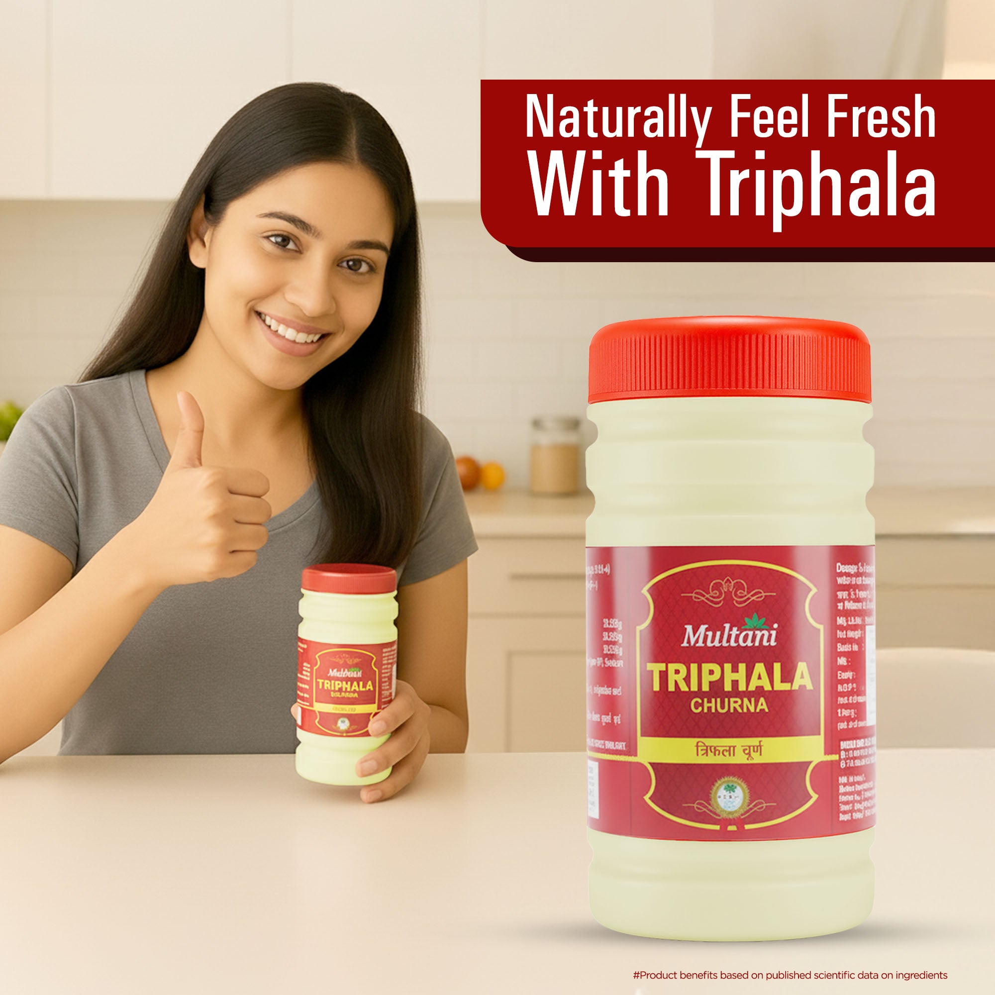 "1. Gentle Digestion & Relief from Constipation: Multani Triphala Churna is an herbal laxative that eases bowel movements and reduces bloating. It promotes a healthy gut.