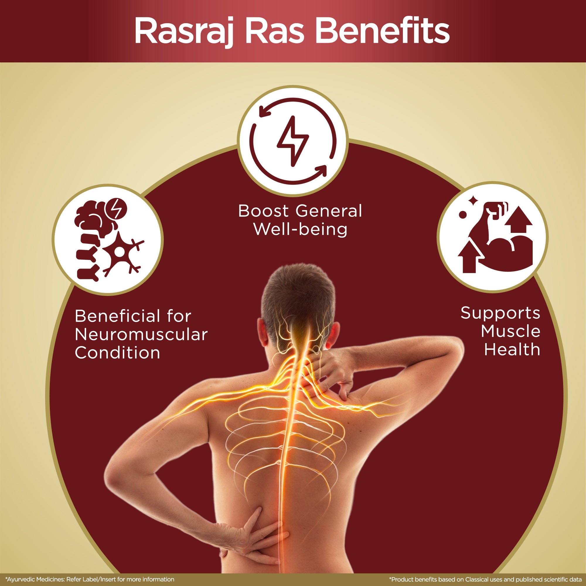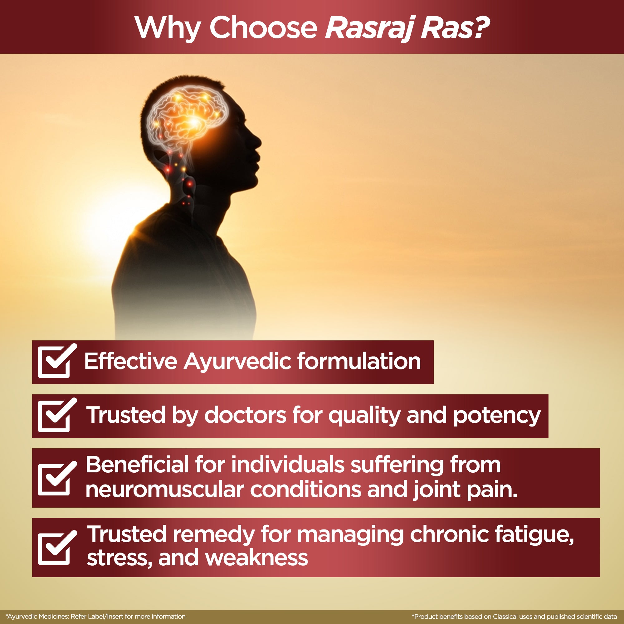 Rasraj Ras is particularly beneficial for individuals suffering from neuromuscular disorders, paralysis, facial palsy, tremors, and joint pain. It helps in enhancing nerve functions and improving mobility. The presence of potent ingredients like Swarna Bhasma, Rajat Bhasma, and Abhrak Bhasma makes it an excellent remedy for managing chronic fatigue, stress, and weakness.