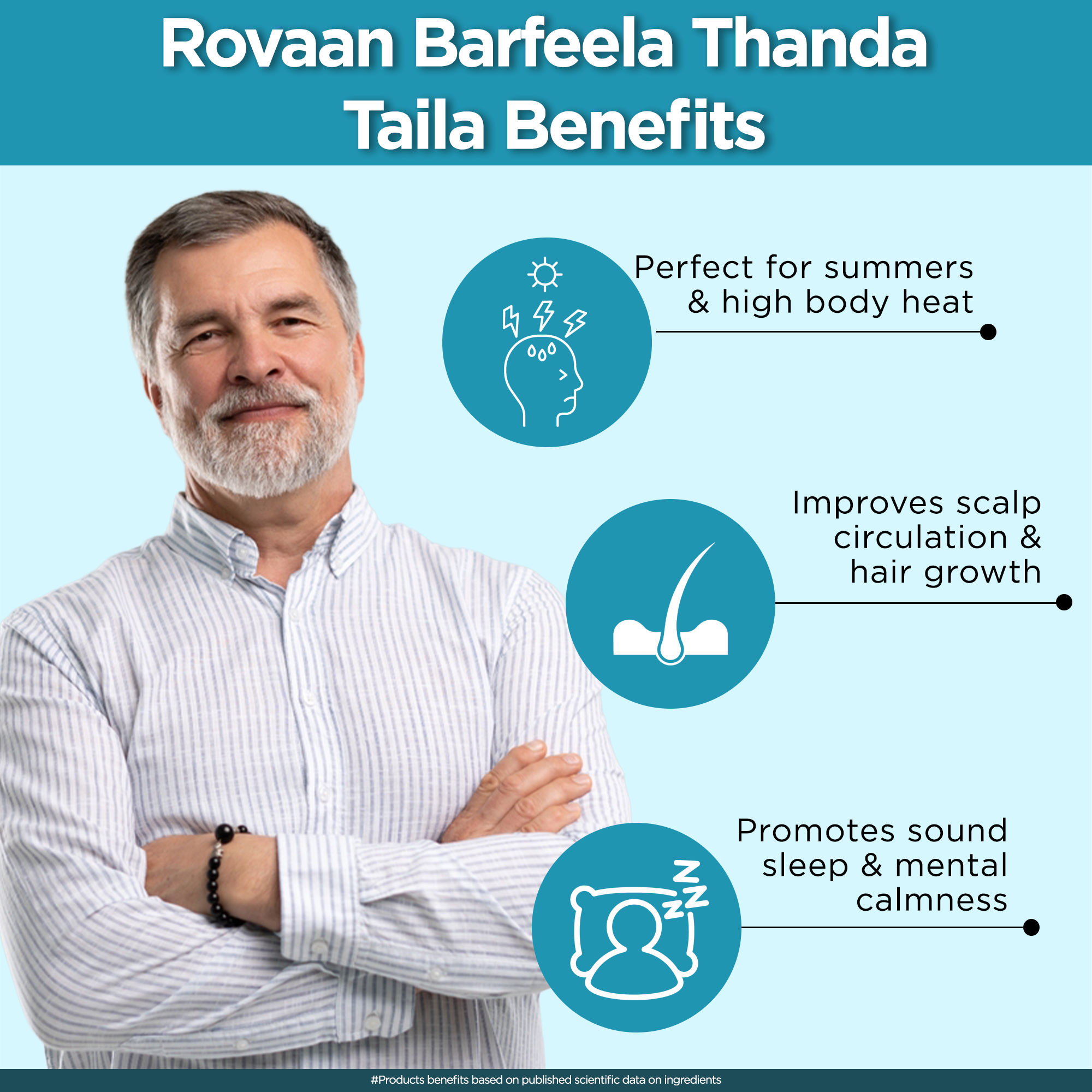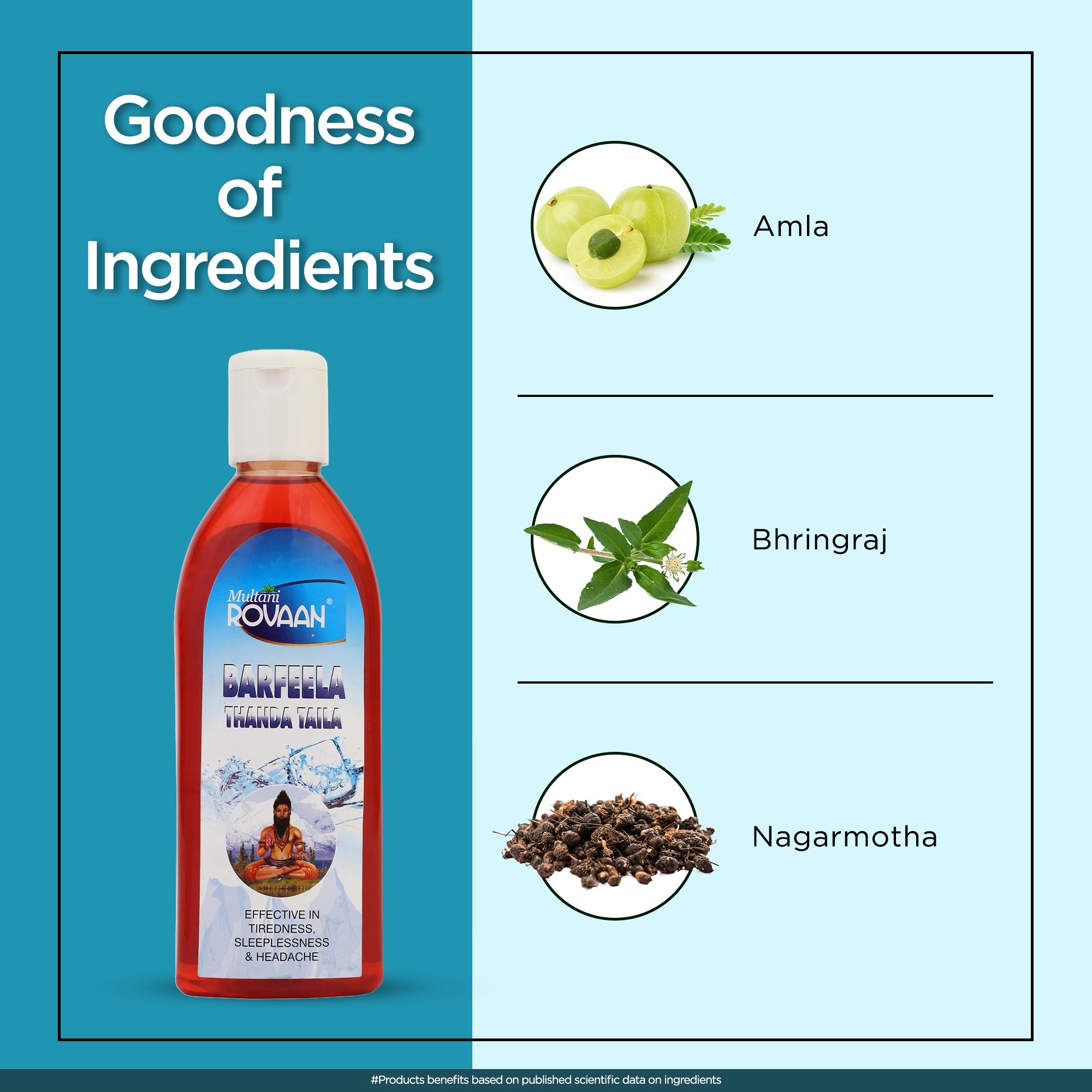 The key ingredients in Multani Rovaan Barfeela Thanda Taila include natural herbs and oils known for their cooling and therapeutic properties. It helps in relieving headaches, reducing stress, and promoting better sleep. The cooling sensation of the oil provides instant relaxation to the body and mind, making it a great choice for those suffering from fatigue and stress-related discomfort.