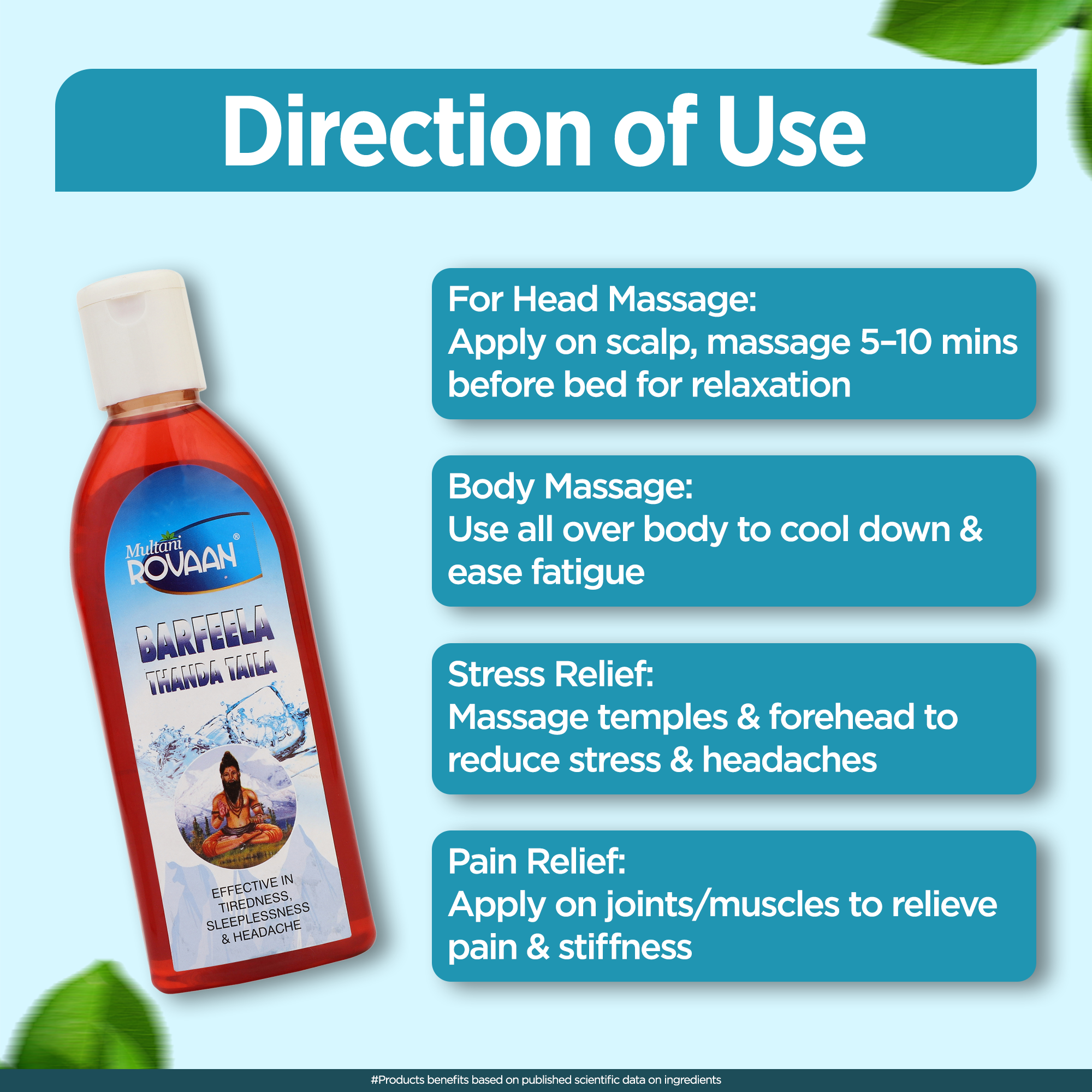 Generic Product Name: Multani Rovaan Barfeela Thanda Taila | Use full for Effective in Tiredness, Sleeplessness & Headache