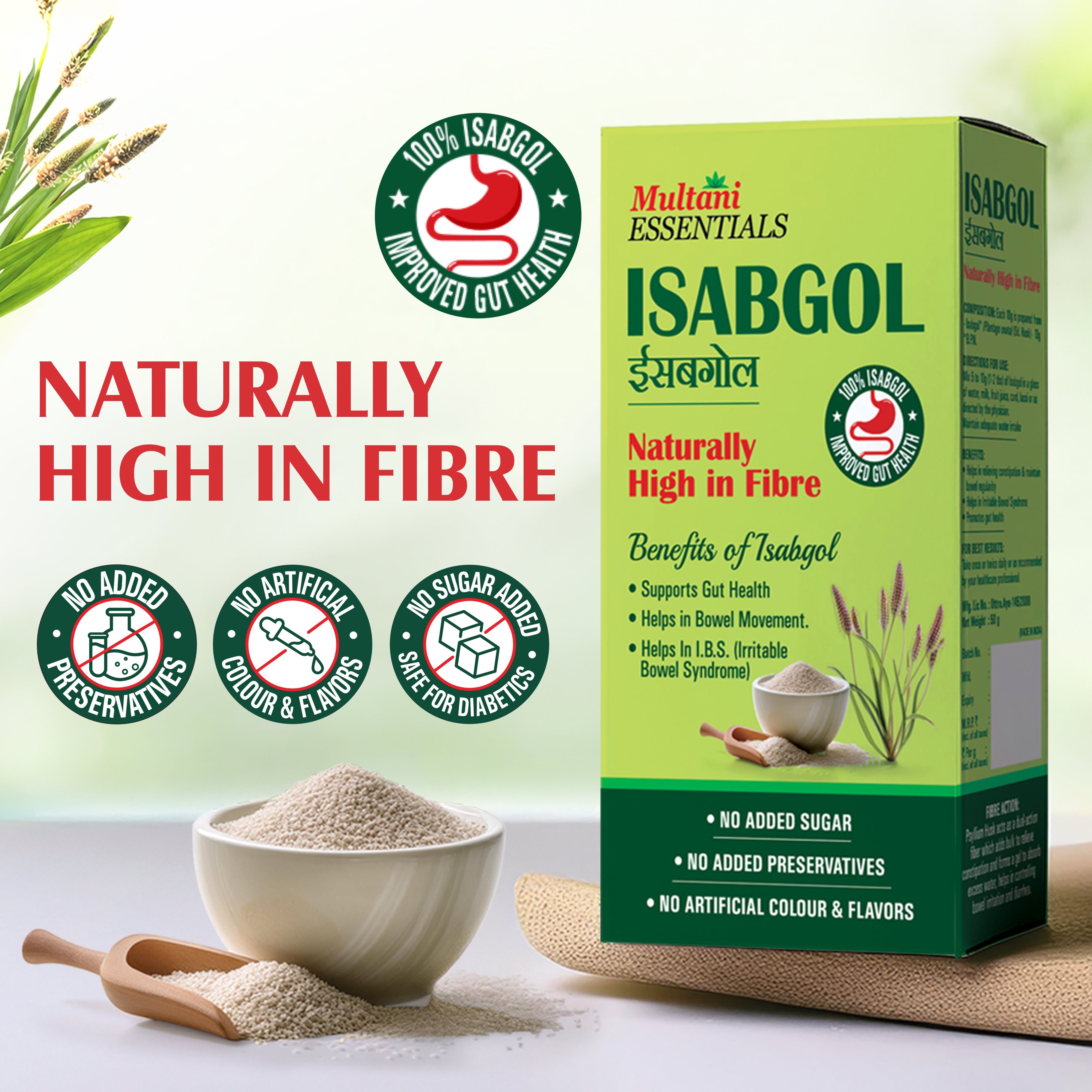 Multani Essentials Isabgol | Natural High Fiber | Helps Manage Constipation, Gut Health And Irritable Bowel Syndrome | Chemical Free | No Added Sugar Or Artificial Flavour | 100% Isabgol | Bowel Movement | Digestion & Gut Health - 50 GM(1.8/ Per GM)