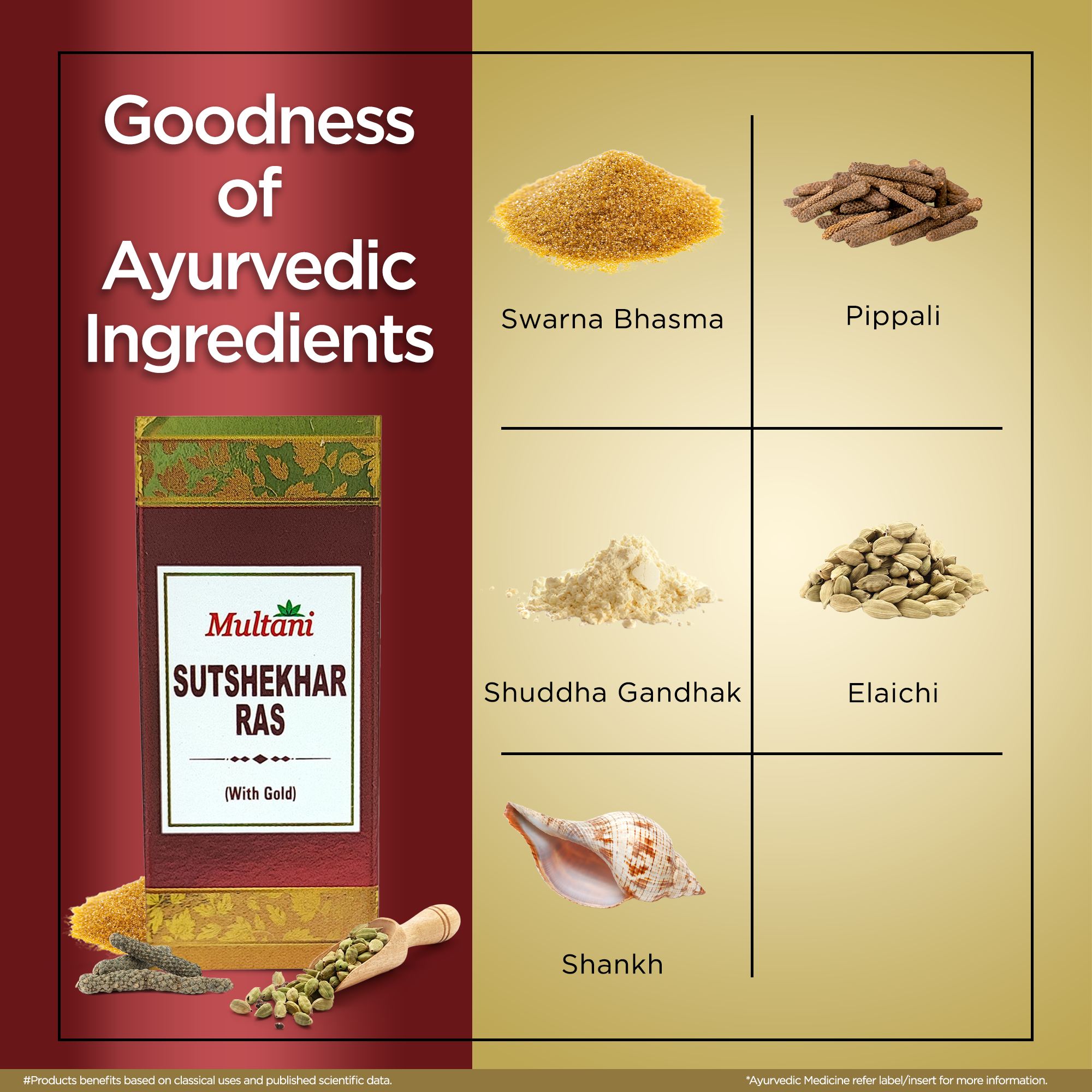 Sutshekhar Ras, Swarn Bhasma, Shuddha Gandhak, Pippali, Elaichi, Tamra Bhasma.