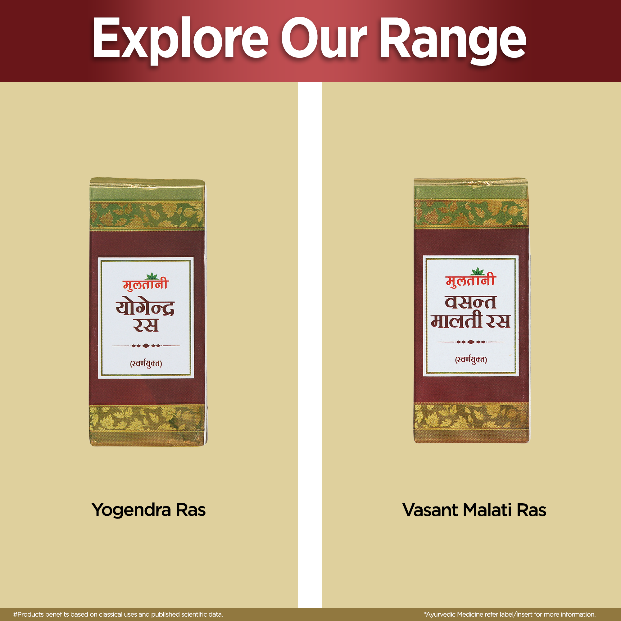 "Multani Sutshekhar Ras with Gold is a classical Ayurvedic formulation that helps in balancing Pitta and Vata doshas in the body. It is widely used for treating digestive disorders, acidity, heartburn, nausea, and gastritis. Enriched with Swarna Bhasma (Gold Ash), this herbal-mineral blend enhances its potency and effectiveness.