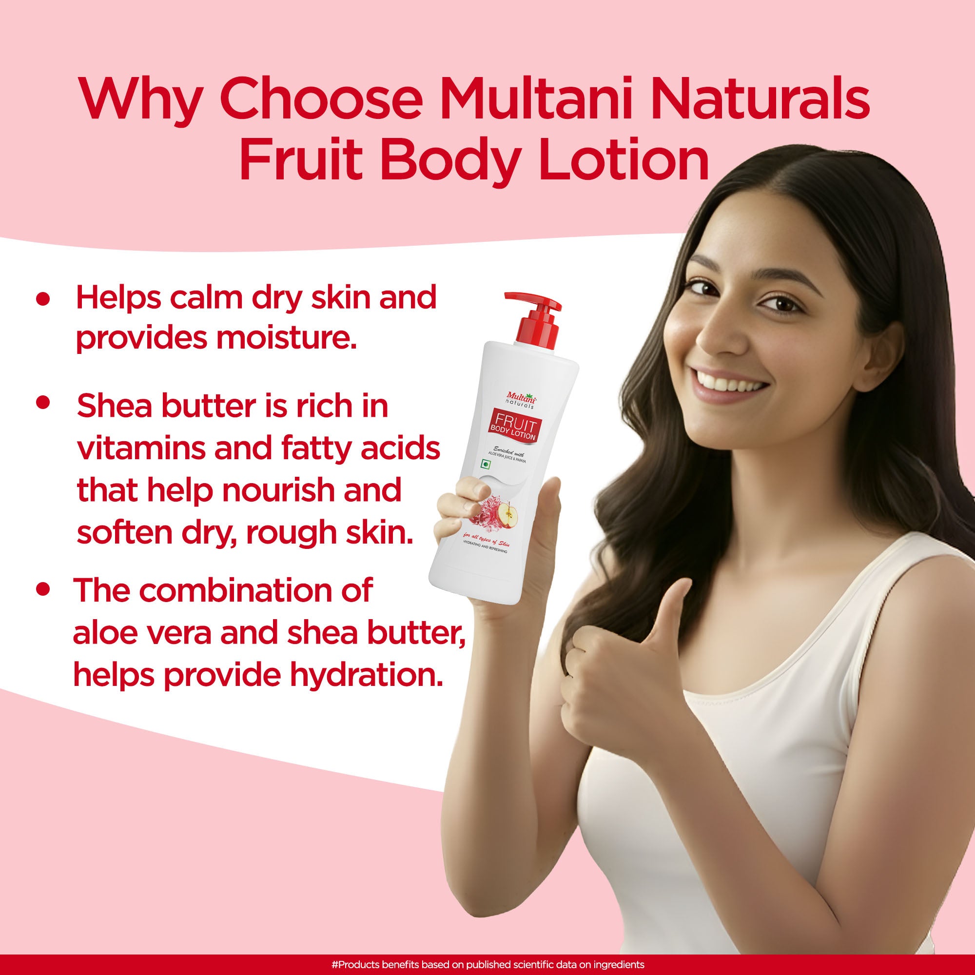 Multani Naturals Fruit Body Lotion with Aloe Vera Juice & Papaya deeply hydrates, nourishes, and brightens skin, leaving it soft, smooth, and radiant.