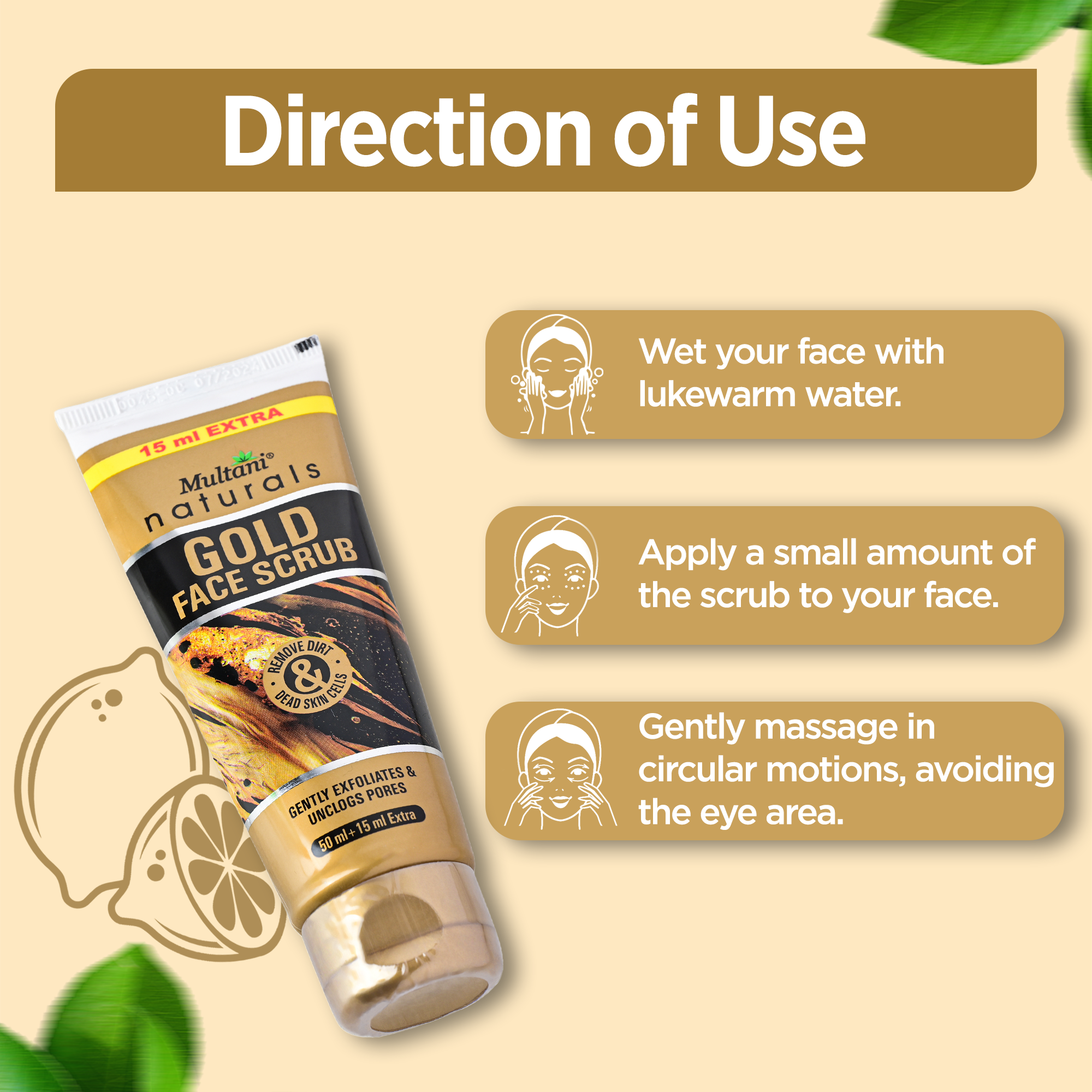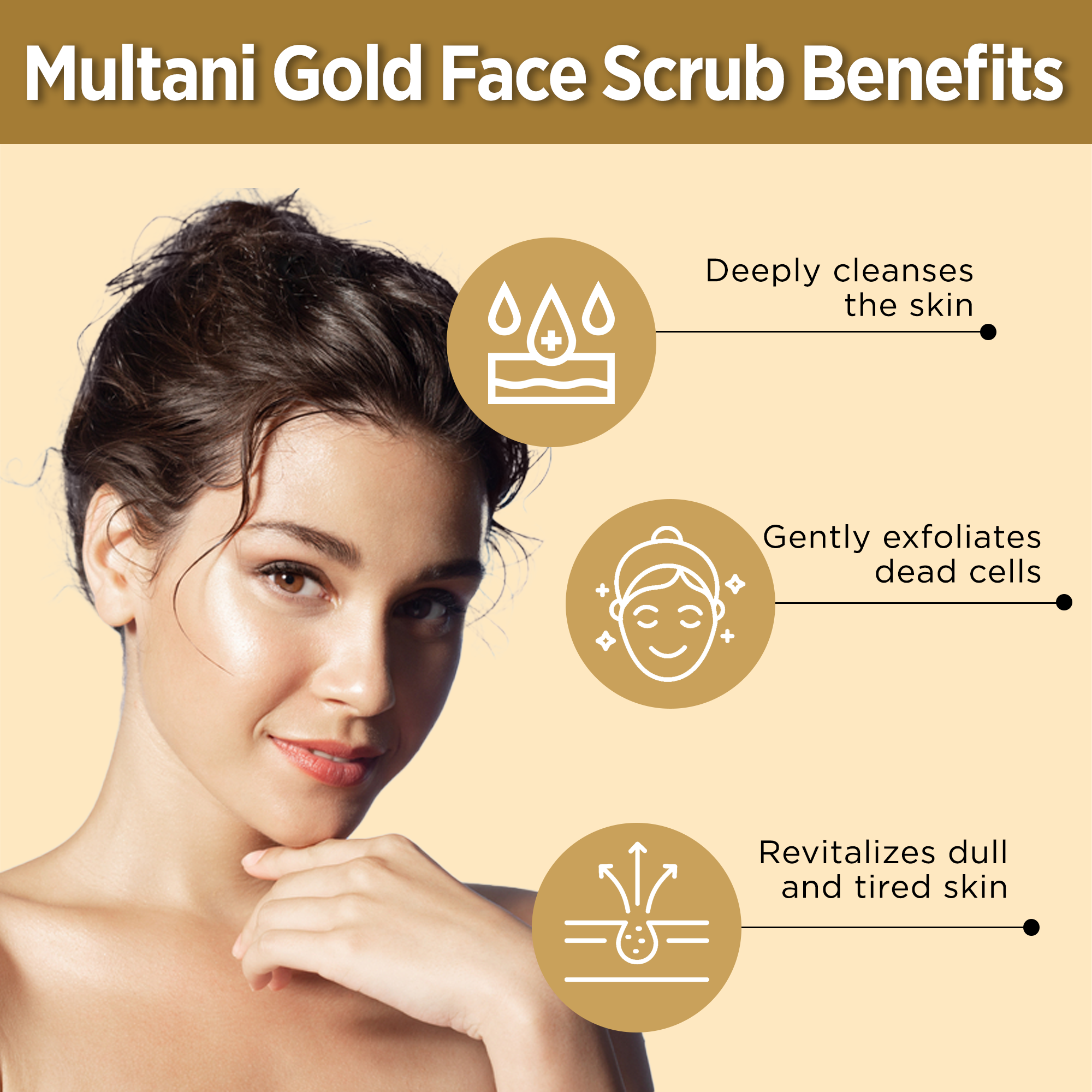 Multani Naturals Gold Face Scrub deeply cleanses, exfoliates, and revitalizes skin, leaving it radiant and refreshed.
