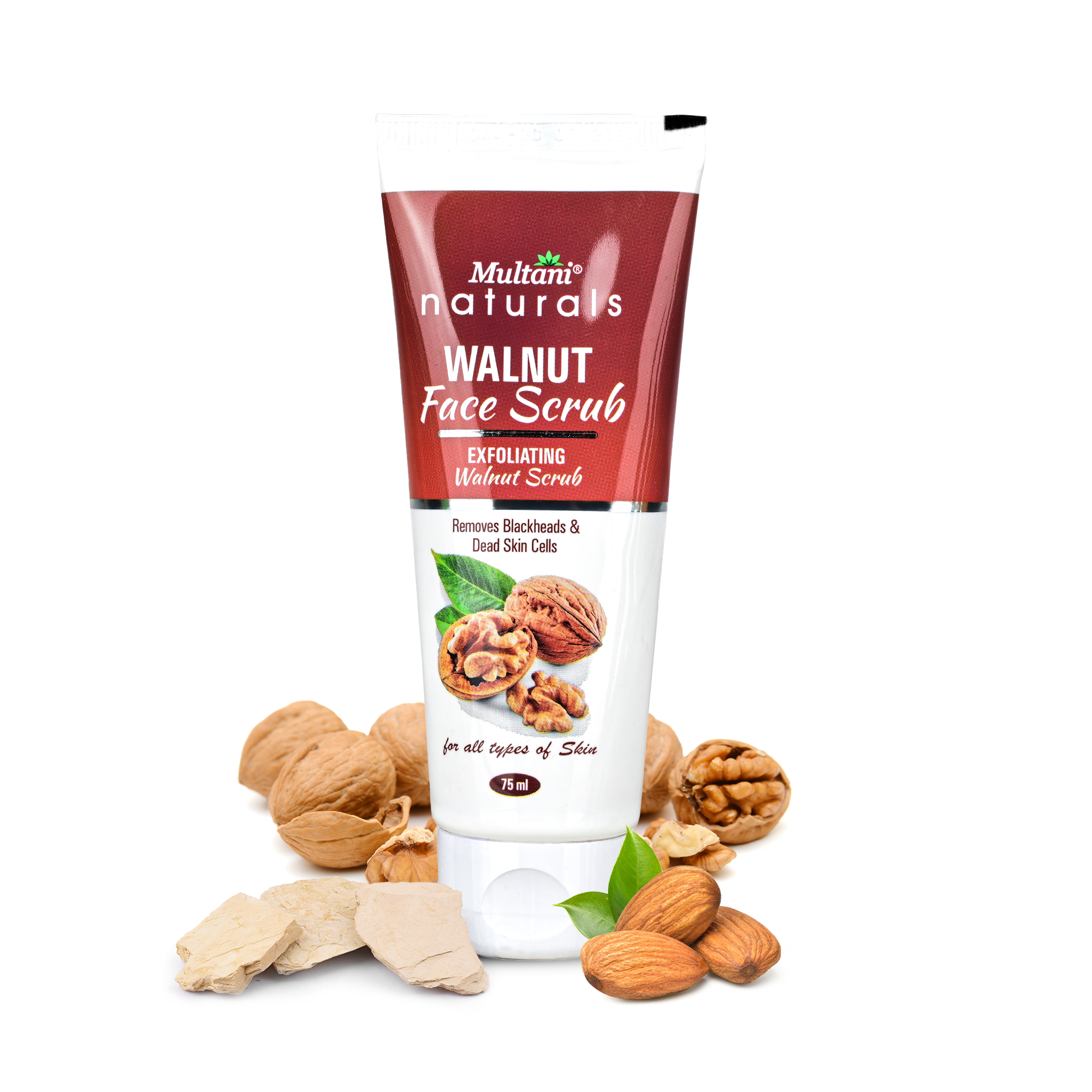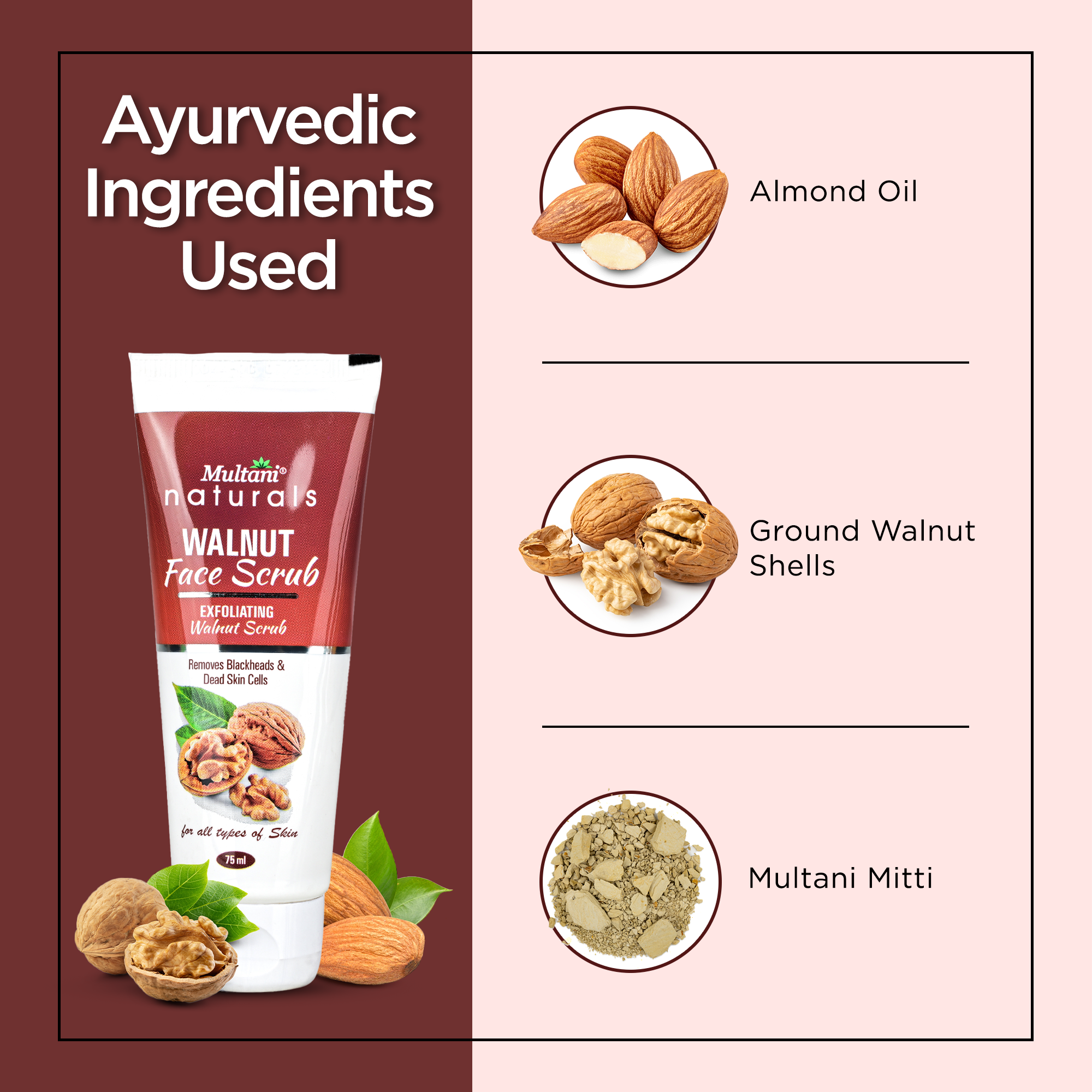 Walnut granules, Aloe vera, Rose water, Glycerin, Almond oil, Honey, Natural extracts.