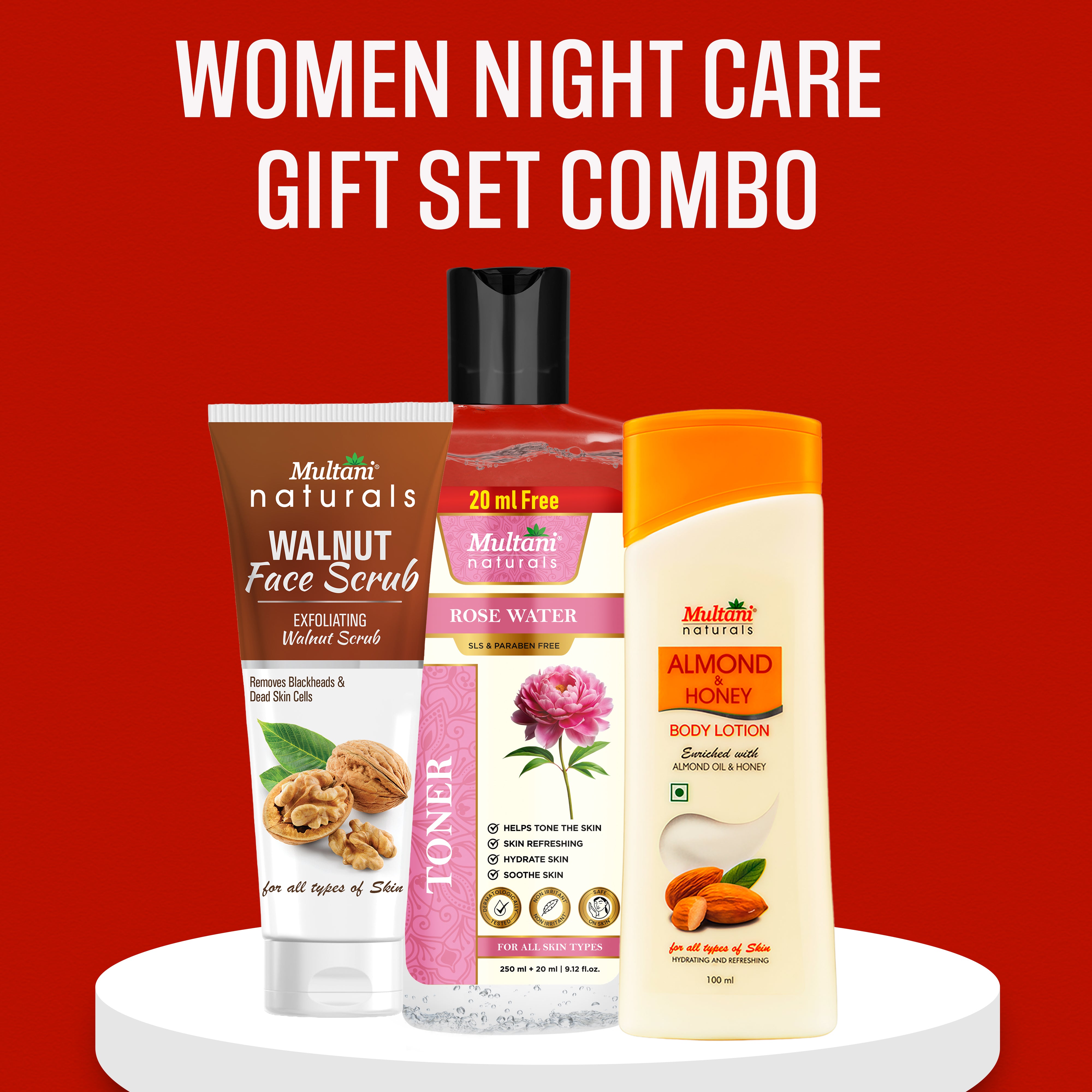 Generic Product Name: Multani Naturals Womens Night Care Gift Sets (Face Scrub| Toner| Body Lotion)
