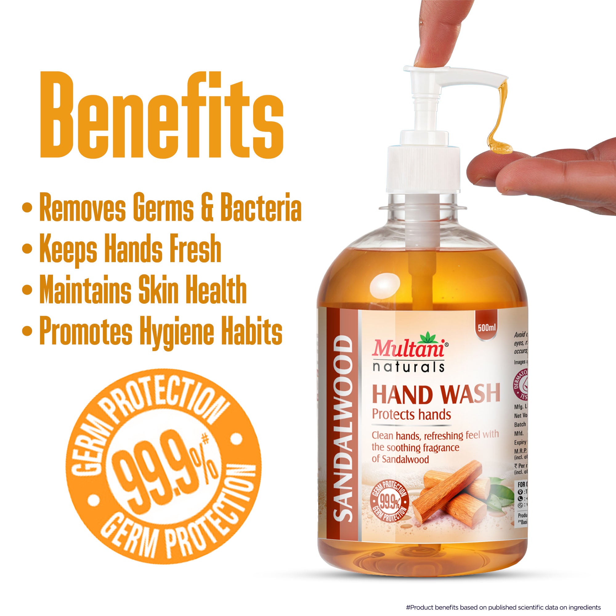 Multani Naturals Hand Wash Sandalwood | Clean Hands,| Refreshing feel with the soothing fragrance of Sandalwood | 99.9% Germ Protection - 500 ml (0.26/Per ml)