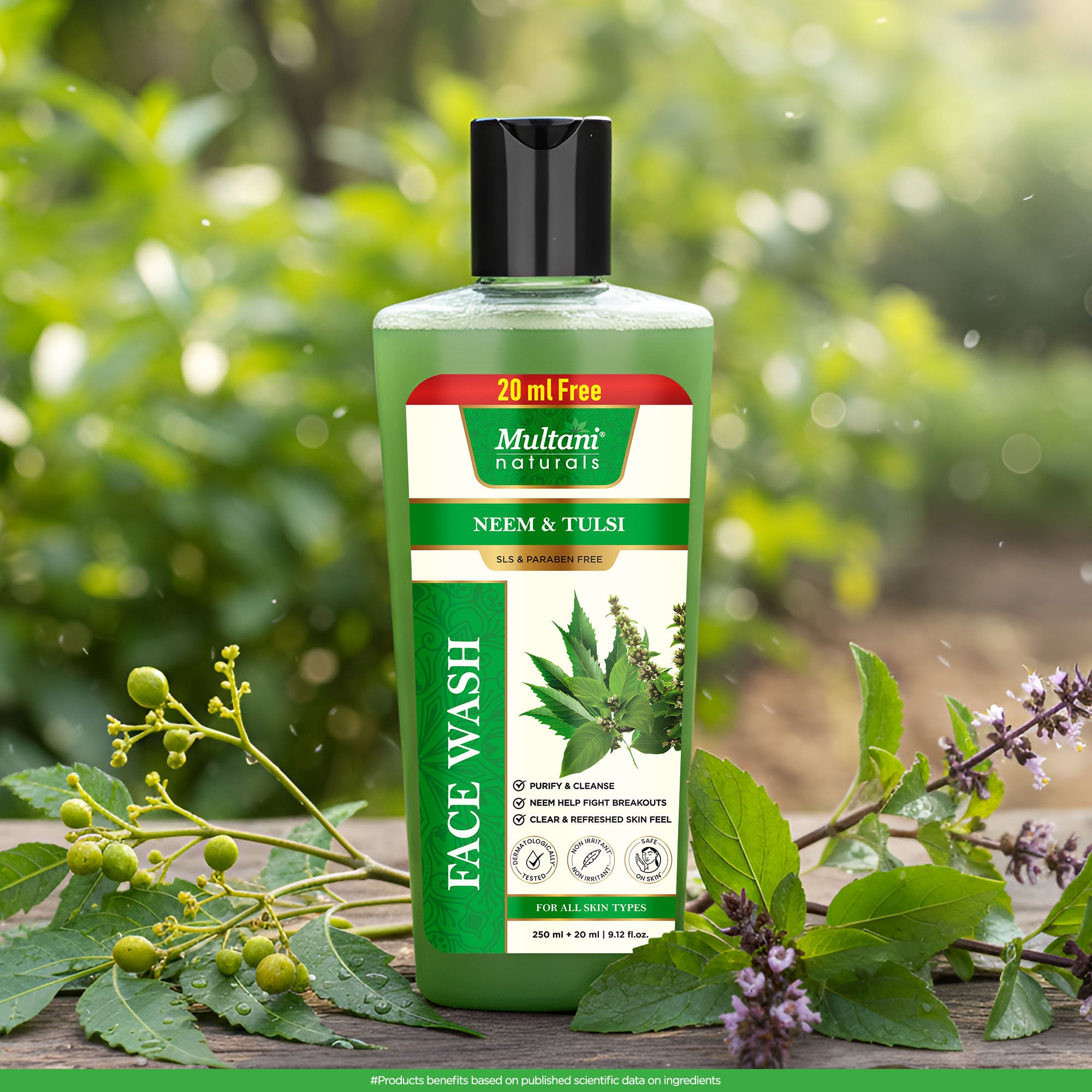 Power of Neem & Tulsi for Clearer Skin: Experience the combined benefits of Neem and Tulsi with Multani Naturals Face Wash, a gentle yet effective cleanser designed to Promote Clear and Healthy Skin. Neem, known for its Anti-Inflammatory, Antiseptic and Anti-Fungal Properties, works to control Excess Oil Production, helping to Prevent Breakouts, Repair Skin Damage and Treat Acne. Tulsi, a time-tested skincare ingredient, enhances overall Skin Health, Improving Texture and leaving your complexion looking Refreshed and Revitalized.