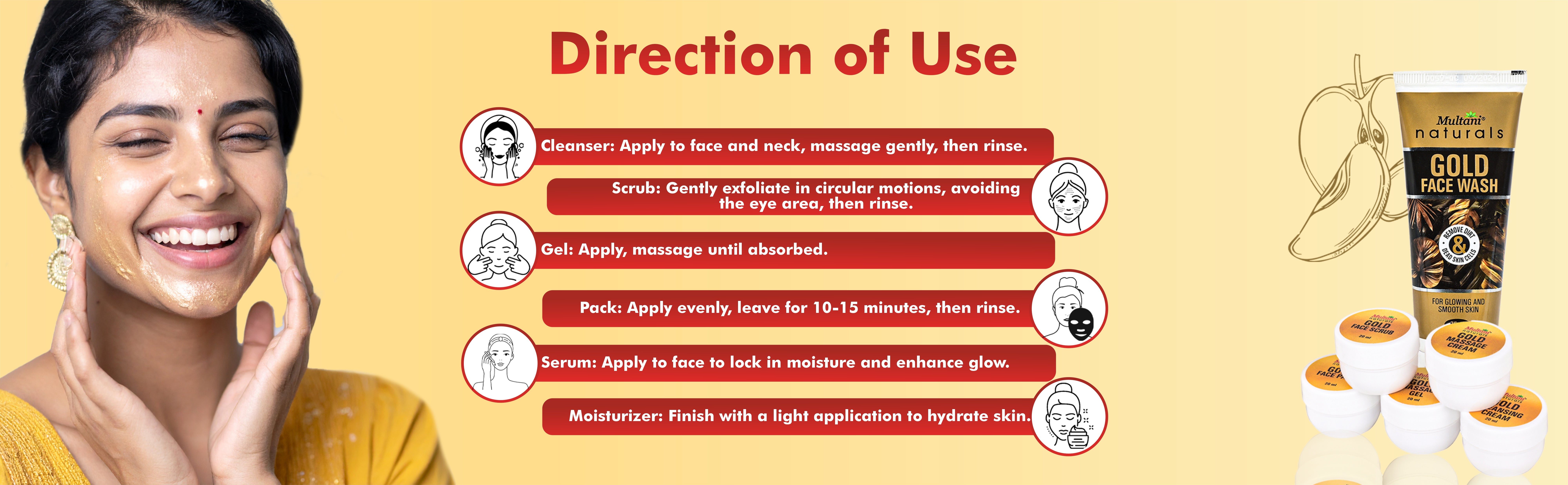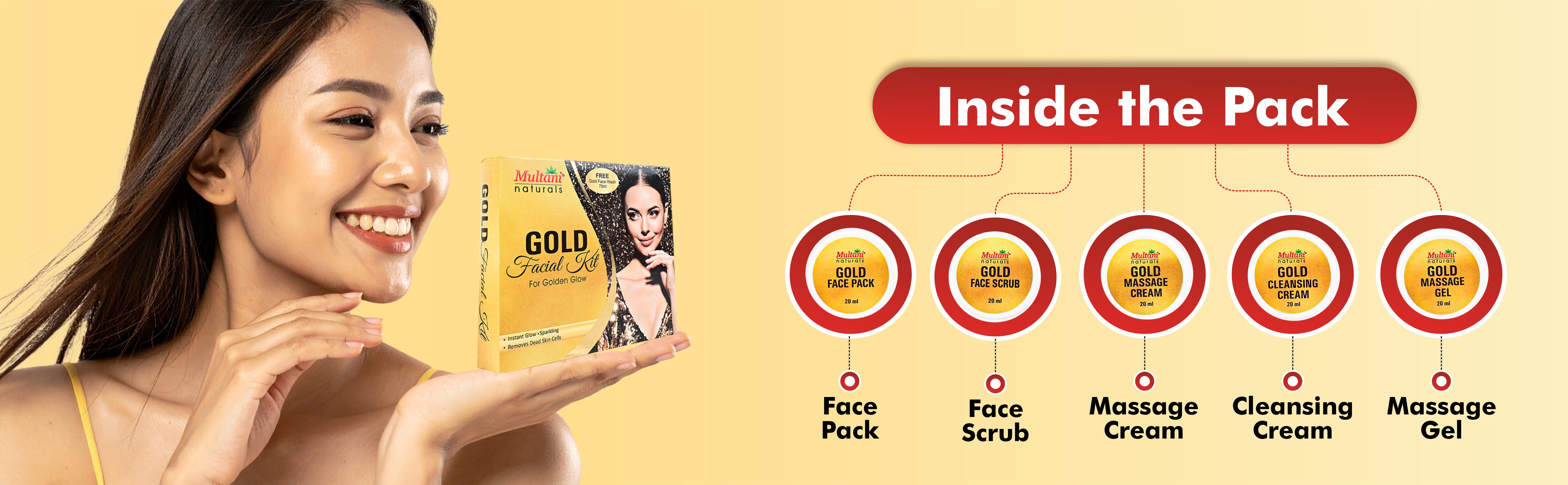 The Multani Naturals Gold Facial Kit is an Ayurvedic skincare regimen designed to rejuvenate and enhance your skin's natural glow. This comprehensive kit typically includes several components, each formulated with natural ingredients to provide a complete facial treatment. While specific formulations may vary, a standard gold facial kit often contains the following products:
